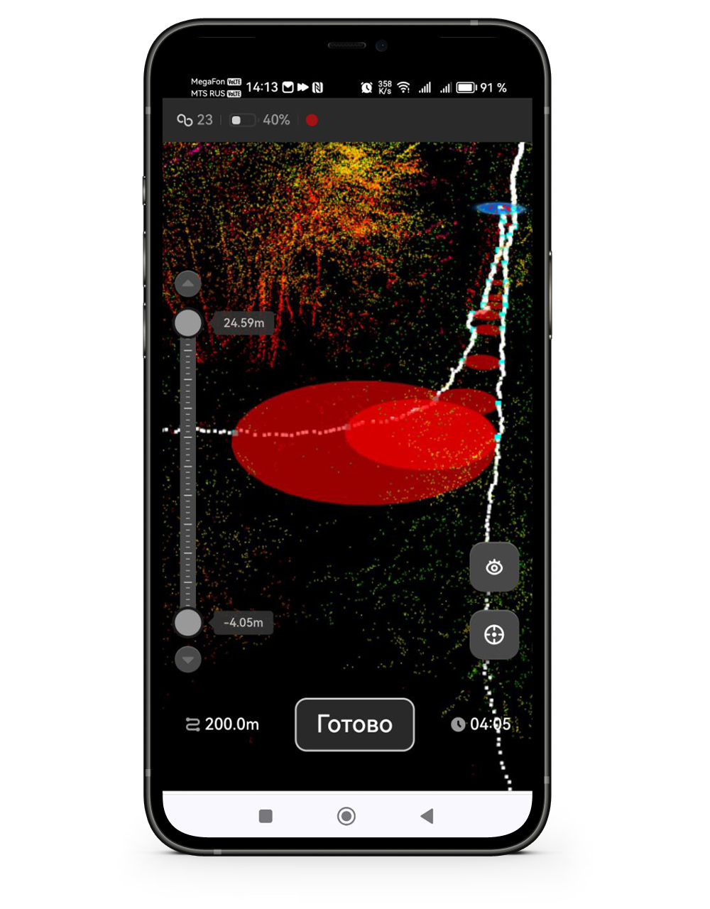 При приближении к началу трека на экране смартфона можно видеть красный круг, это говорит о том, что замыкание выполнено, можно завершать сканирование.